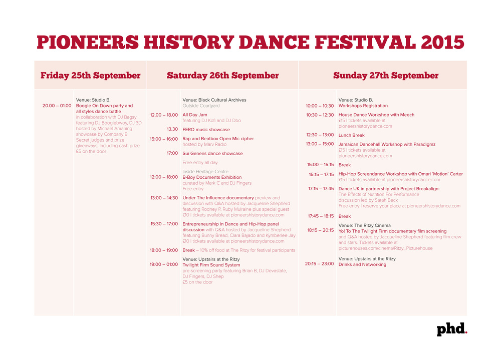 Big thanks go to Ty ( http://www.tymusic.co.uk/ ) for the initial hook up and Tania plus her team from PHD and the Black Cultural Archives for making it possible. There’s an entire weekend of activities, workshops, panels and events, so please check the schedule below and at http://www.pioneershistorydance.com/schedule/
